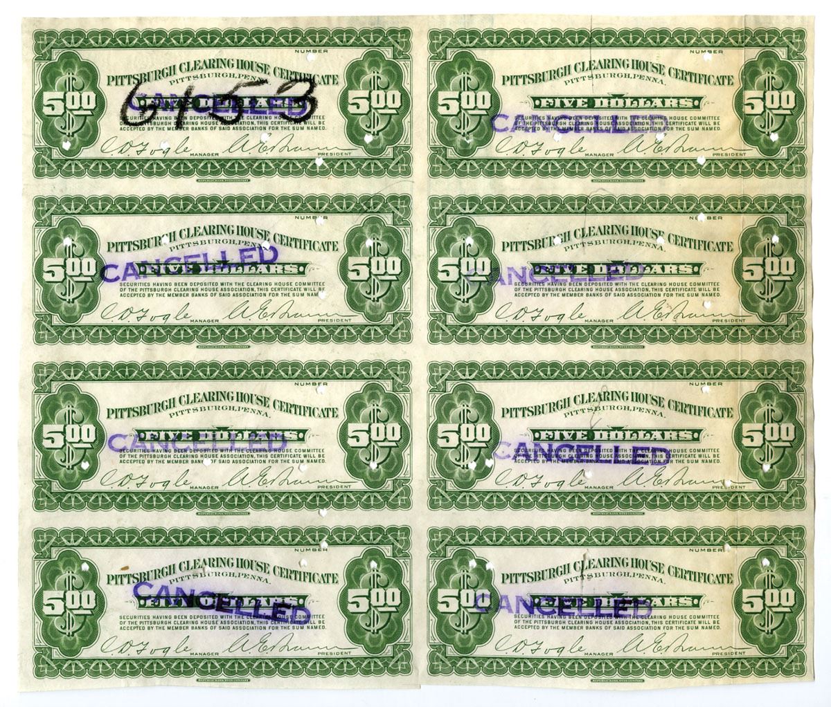 Pittsburgh, Pennsylvania, ND (1907). Uniface Uncut sheet of 8 Proof $5 depression scrip notes, Green printing with purple cancelled stamps and POCs, VF to XF condition, RBNC. The federal government frowned upon using clearing house associations for the 1933 Depression scrip issues. Though there is no date, we are confident this fits the earlier 1907 style and format and not the later 1933 Depression Scrip designs. (1 sheet of 8 notes)