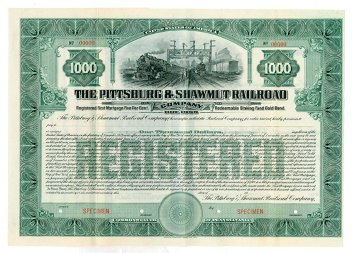Pennsylvania. Specimen $1000 Registered First Mortgage 5% Per Cent Redeemable Sinking Fund Gold, Due1959, green trains and trackworkers, with stubs attached, Uncirculated, POC's, folded in thirds as made. ABNC. Unlisted as a Registered Bond in Cox.