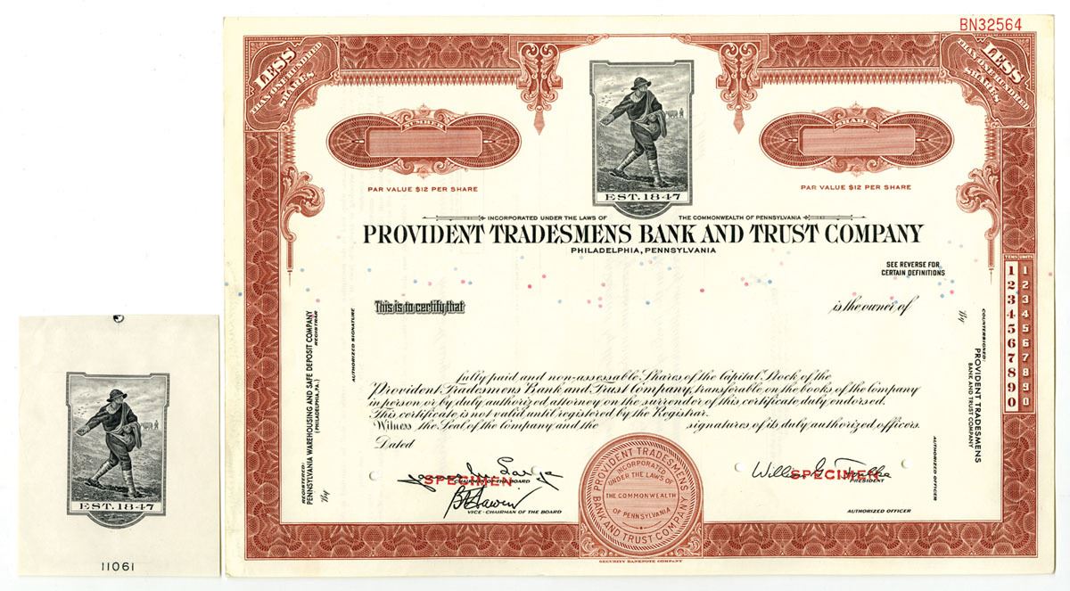 Philadelphia, Pennsylvania, ND (1930s to 1950s), Lot of 2 items includes <100 Shrs Specimen Stock Certificate, Black print with rust brown border, farmer vignette above title; and proof vignette on thin white paper with label "EST. 1847", Black print, S/N 11061 on bottom of paper. Items range from XF to AU condition. SBNC.