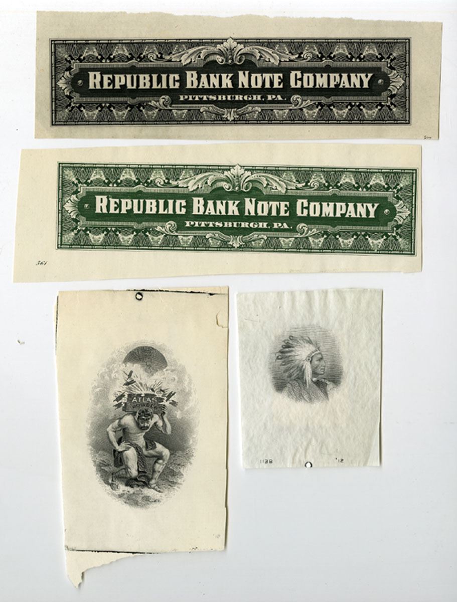 Pennsylvania, ND (1900-10s). Lot of 4 Vignettes and Bond Titles, Includes: Republic Bank Note Co. Proof Bond titles with Green and Black print; Atlas Powder company vignette; Native Chief vignette used on Wells Fargo Traveler's Checks. Items range from VF to Unc condition. (4). Sold "AS IS" no returns accepted.
