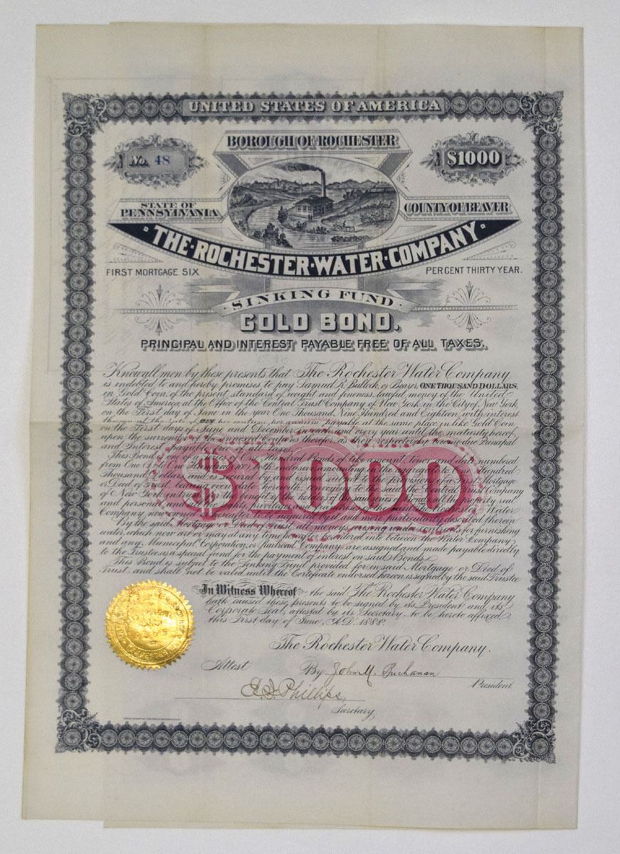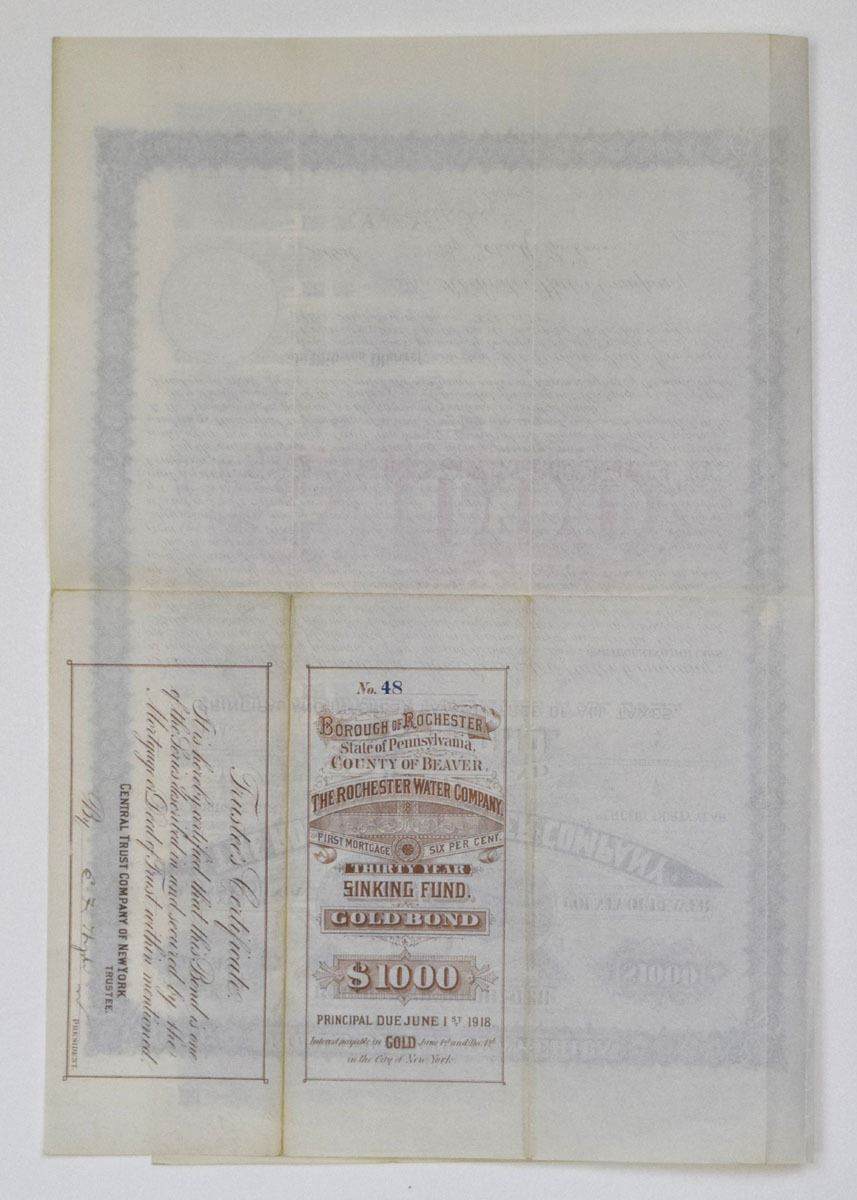 Rochester, Pennsylvania. Rochester Water Co., 1888 $1000 I/U 6% Sinking Fund Gold Coupon Bond, XF