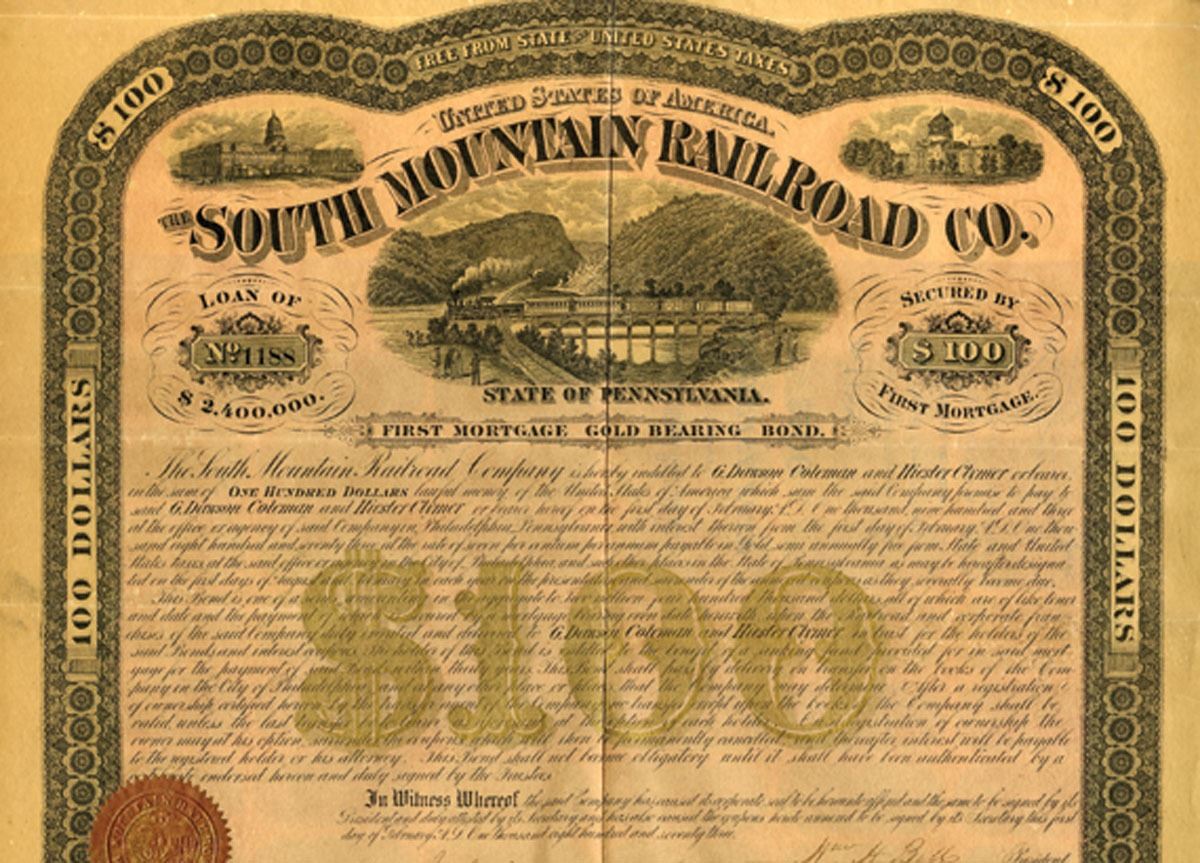 Pennsylvania, 1873. $1000 I/U 7% First Mortgage Gold Coupon Bond, Black text with black border and gold underprint printed on light brown paper on large oversized certificate, Train passing over bridge with men surveying at top center, S/N 1188, Fine to VF+ condition on toned paper. Extremely attractive bond.