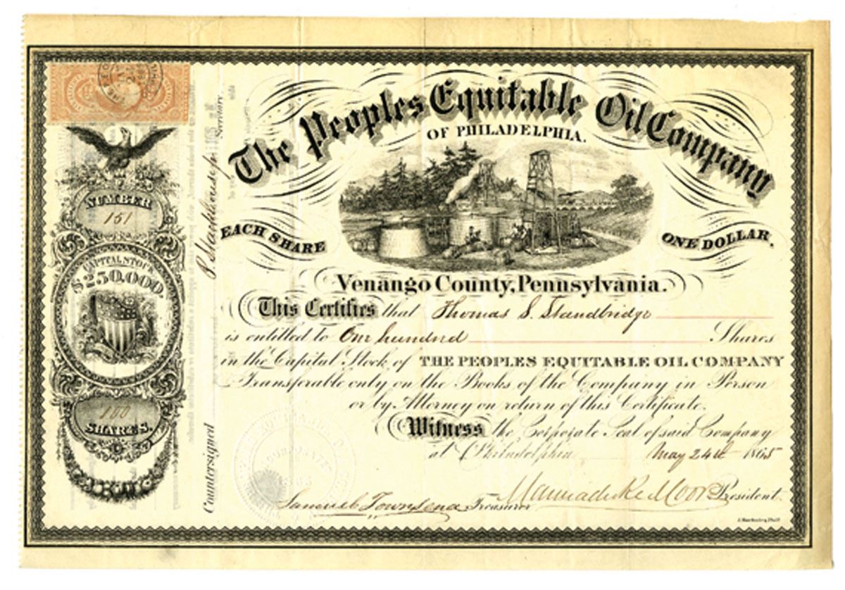 Philadelphia, PA, 1865, The Peoples Equitable Oil Company, 100 Shares Stock Certificate (I/U). Printed in black with an ornate border and a decorative shield at left topped by an eagle, with a central vignette of oil derricks, tanks, and laborers at work in Venango County; a red 25¢ U.S. Internal Revenue stamp is affixed at upper left and an embossed company seal appears at bottom; incorporated in 1865 with capital of $250,000 to participate in the Pennsylvania petroleum boom that followed Edwin Drake’s 1859 discovery; issued to Thomas S. Standridge and hand-signed by the president and treasurer, dated May 24, 1865; Choice VF condition or better. Printed by J. Haehnlen, Philadelphia.