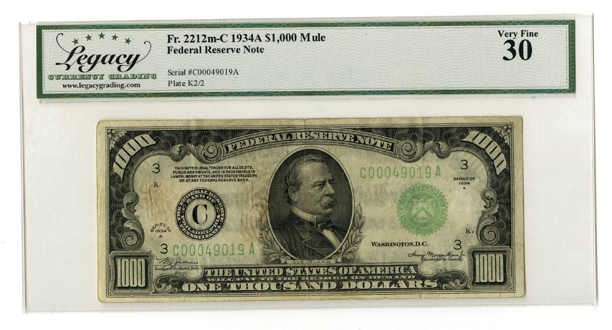 Philadelphia, Pennsylvania. $1000 Series of 1934A, Fr.# 2212-C, Mule, Philadelphia district "C", Issued Federal Reserve Banknote, Grover Cleveland at center and Green seal at right, Julian | Morgenthau Signatures, S/N C00049019A pp K2/2, Legacy graded Very Fine 30. BEP.