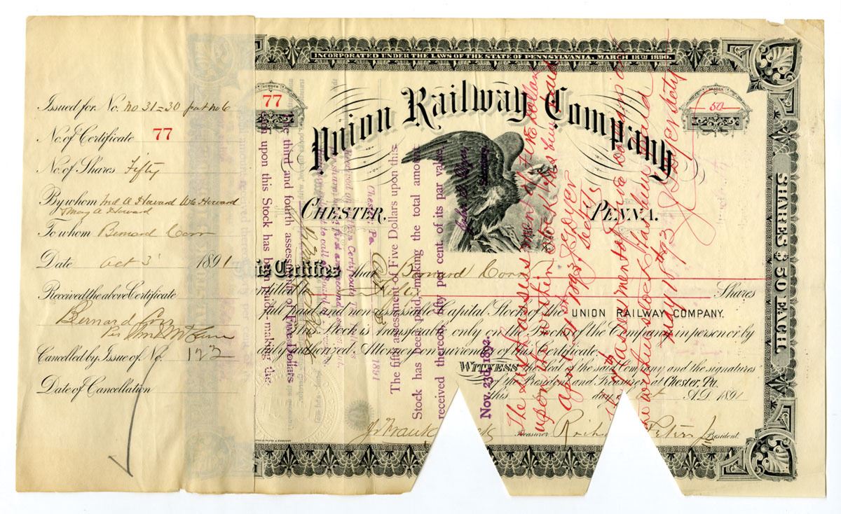 Chester, Pennsylvania, 1891. 50 Shares Capital Stock I/C Certificate, Black print with black border, Bald Eagle at center under title, S/N 77, Hand cancelled and cut cancelled along bottom margin, VF to VF+ condition with minor damage to top right corner.