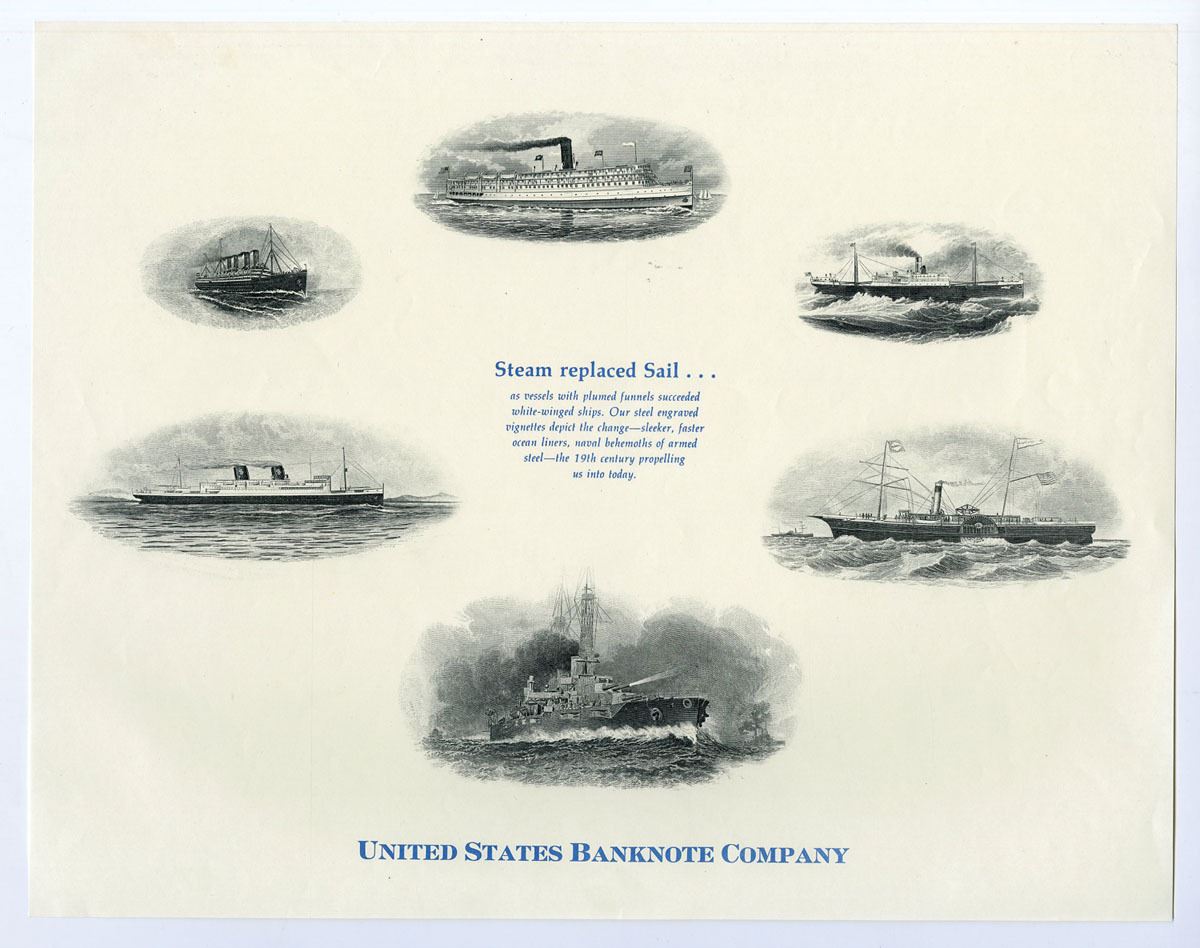 Pennsylvania, ca.1870-1900s. Printed vignette proof sheet by the United States Bank Note Company, featuring a central thematic caption “Steam replaced Sail…” surrounded by finely engraved maritime scenes illustrating the evolution of naval and commercial marine technology, Blue text and black images, Likely produced as a promotional or specimen engraving sheet demonstrating engraving quality and subject matter suitable for securities, bonds, or certificates. Condition is VF overall. USBNC