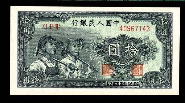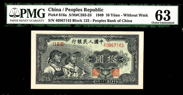 China, 10 Yuan, P-816a, S/M#C282-23, No Watermark, Block 123, S/N 40967143, PMG graded Choice Unc. 63. Attractive for issue.