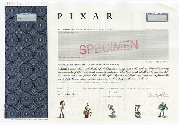 California. Odd Shares, Black on m/c, Early PIXAR animation characters on bottom, XF/Unc condition. Popular and attractive specimen from this famous pioneer animation company.