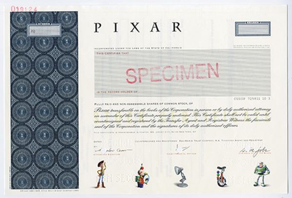 California. Odd Shares, Black on m/c, Early PIXAR animation characters on bottom, XF/Unc condition. Popular and attractive specimen from this famous pioneer animation company. Pixar Animation Studios is an American computer animation film studio that is a subsidiary of The Walt Disney Company. Pixar began in 1979 as the Graphics Group, part of the Lucasfilm computer division, before its spin-out as a corporation in 1986, with funding by Apple Inc. co-founder Steve Jobs, who became the majority shareholder. Disney purchased Pixar in 2006 at a valuation of $7.4 billion by converting each share of Pixar stock to 2.3 shares of Disney stock, a transaction that resulted in Jobs becoming Disney's largest single shareholder at the time.