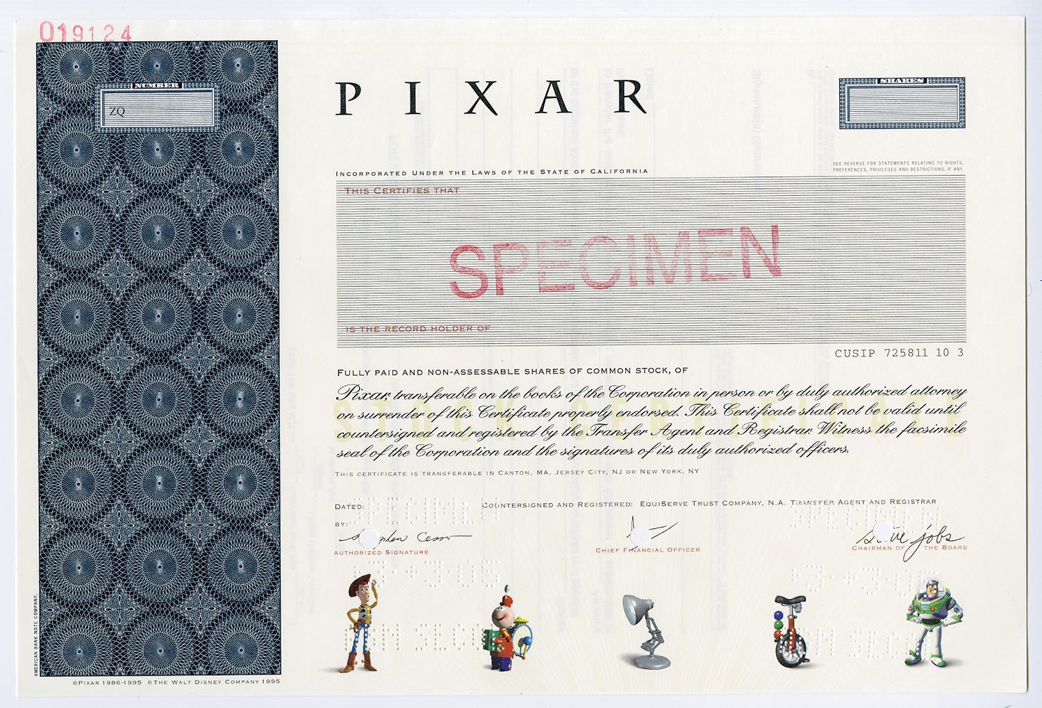 PIXAR, 2005 Specimen Stock Certificate with Steve Jobs Facsimile Signature.