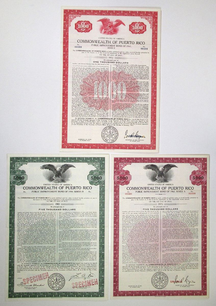 Puerto Rico, 1961 to 1969, Lot of 3 Specimen Bonds, Includes: 1961, $1000 3 1/2% Series B Public Improvement Coupon Bond, Black with red border; 1963, $5000 5% Series A Public Improvement Coupon Bond, Black with maroon border; 1969, $5000 6% Series B Public Improvement Coupon Bond, Black with green border. All have Bald Eagle at top center, Specimen overprints, POCs, are in XF to AU condition, printed by ABNC. (3). Sold "AS IS" no returns accepted.