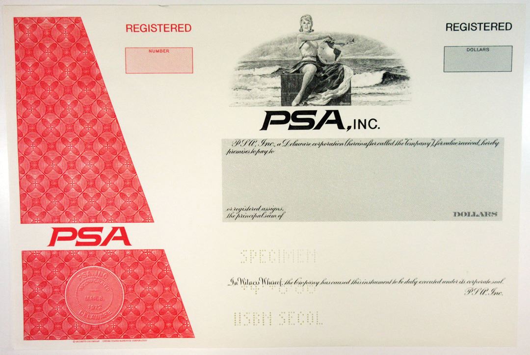PSA, Inc., 1986 $Odd Registered Odd% Proof Specimen Bond, Pink, XF, S-C USBNC. Pacific Southwest Airlines (PSA) was a United States airline headquartered in San Diego, California, that operated from 1949 to 1988. It was the first large discount airline in the United States. PSA called itself "The World's Friendliest Airline" and painted a smile on the nose of its airplanes, the PSA Grinningbirds.