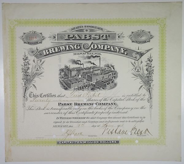 Milwaukee, Wisconsin, 1908. 20 Shares I/C Capital Stock Certificate, Issue #1015, Black text with yellow border, Birds-eye view of Milwaukee is illustrated at center. POC's, VF condition with slight staining along left hand margin. The Milwaukee Lith. Johann Gottlieb Friedrich "Frederick" Pabst (March 28, 1836 _ January 1, 1904) was a German-American brewer for whom the Pabst Brewing Company was named.