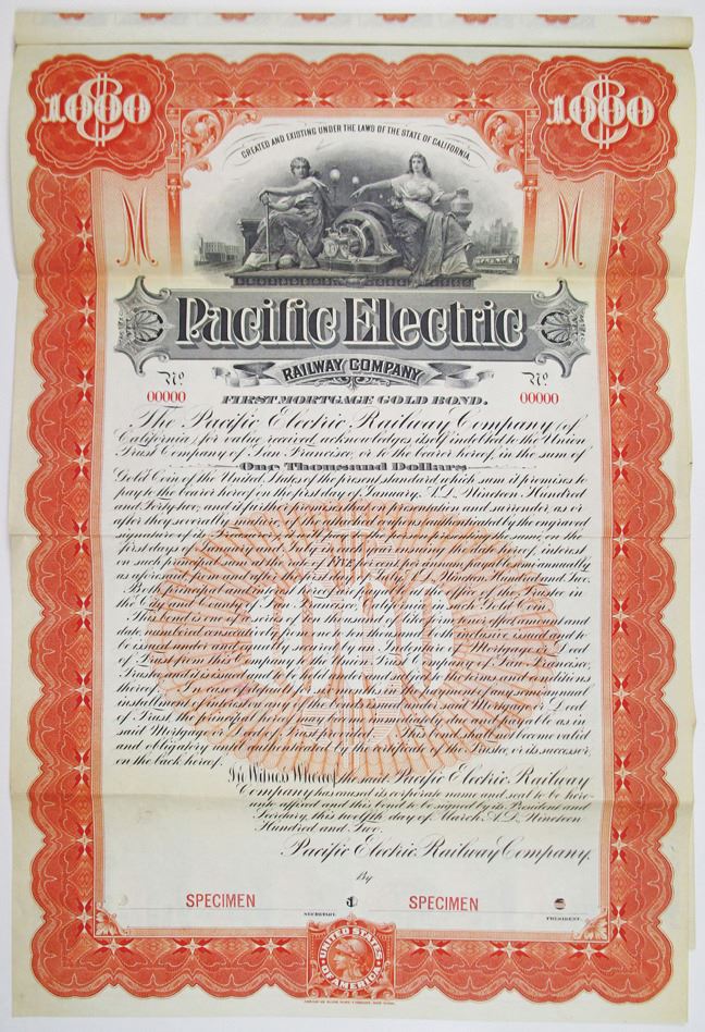 California, 1902. $1000 Specimen 5% First Mortgage Gold Coupon Bond, Black text with orange border and undertint, Pair of allegorical women with generator at top center. Red specimen overprints, 00000 serial numbers, and POCs. VF condition, ABNC. Only bond listed with this design in Cox. Only 2 examples were found in the ABN Archives in 2002.