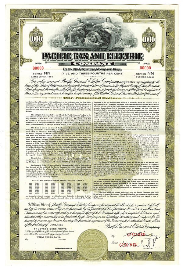 California. $1000 Specimen 5 3/4% Series NN 1st and Refunding Mortgage Coupon Bond, Black print on green border and under tint, Allegorical figures sitting next to a generator at top, Specimen overprints and POC's, VF-XF condition, ABNC.