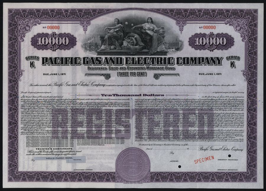California, 19xx, $10000, Series K 3% Registered 1st and Refunding Mortgage Specimen Bond, Horizontal format, Black on purple border and underprint, Two allegorical women flanking a turbine with hydro plants behind them, Red SPECIMEN overprint POC's and red s/n "00000", VF condition with vertical folds, ABNC.