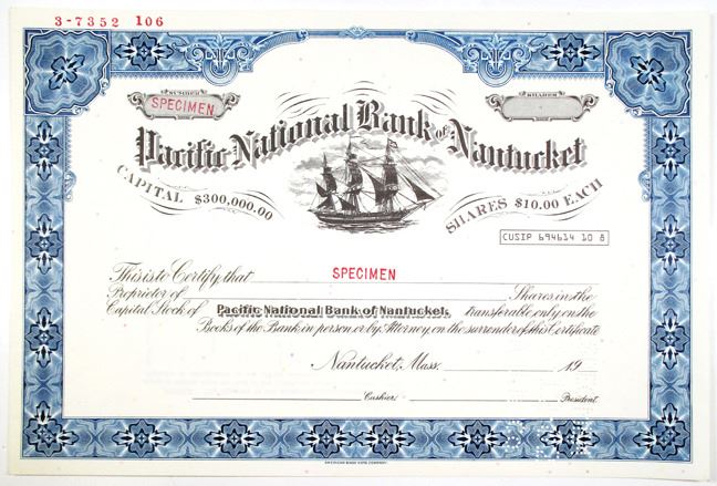 Nantucket, Massachusetts, 1982. Odd Shares Specimen Capital Stock Certificate, Black text with blue border, Ship at sea at top center. Red specimen overprints, Specimen POCs. VF condition, ABNC.