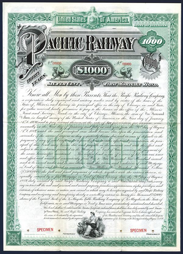 Illinois, 1889, $1000 30 Year 6% 1st Mortgage Specimen Bond, Black printing with green border and underprint, No vignette, POC's and red SPECIMEN overprints, VF condition, ABNC. Listed railroad in Cox but only listed as stock. Rare and attractive bond with only 3 found.