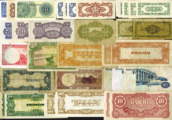 Cambodia, China PRC, Indonesia, Japan, Korea, Nepal, Philippines, Singapore, Viet Nam. Some Uncirculated, but more are Very Good-Fine. 60 pieces.