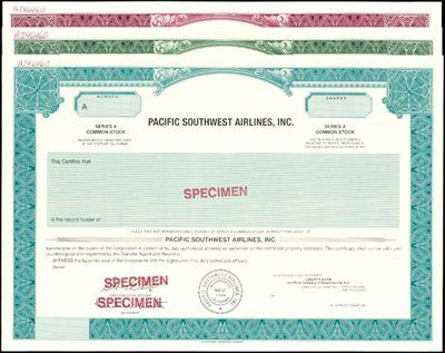 CA. 1994. Specimen. 1) Odd shares. Series A with teal border. 2) Series C with green border. 3) Serise B with red border. The airline was established in 1949 with a leased Douglas DC-3 that flew one weekly round trip from San Diego to Oakland via Burbank. PSA agreed to merge with USAir in 1987. It is one of the four predecessor airlines that form US Airways, the other three airlines being America West Airlines, Piedmont Airlines and Allegheny Airlines. Rare aviation certificates. Jeffries BNC. XF.