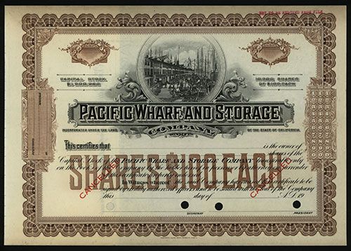 California, 19xx, Specimen Stock, Odd Shares, Black on brown border and underprint, Vignette of busy wharf top center, POC's, VF condition with some toning, SCBNC.
