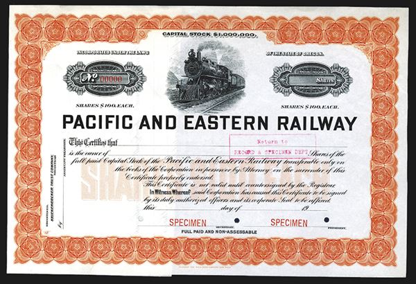 Oregon, Odd Shares, Specimen Stock Certificate, Black on orange border, Locomotive R-L, Only listed in Cox with a similar specimen example, no other varieties are known, XF condition, rare and first time seen by cataloger. ABNC.