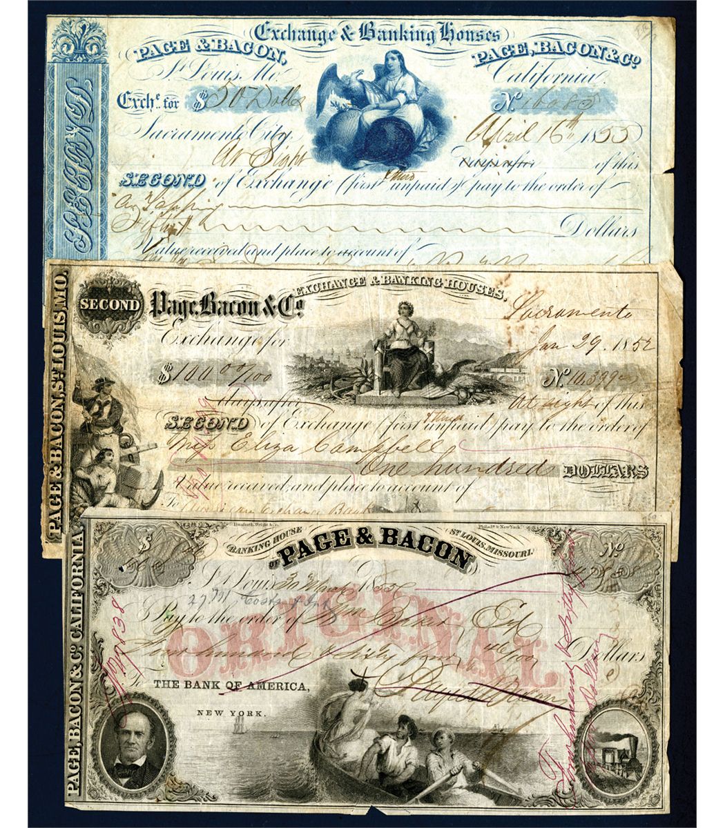 Sacramento, California and St. Louis, Missouri. Lot of 3 Exchanges, Includes Sacramento, CA, 1852 dated 2nd of Exchange, Fine, TCC; St. Louis and California, 1855, outstanding full vignette in black with light red underprint, Payable at Bank of America, NY, men rowing allegorical woman on bottom, Choice Fine to VF with corner tip missing UL, DW&C; 1855, 2nd of Exchange, Blue on white paper, Seated Indian Maiden with eagle, flag and globe, payable in Pittsburg, Pennsylvania, VF, TCC. Very attractive Gold Rush era bills of exchange.