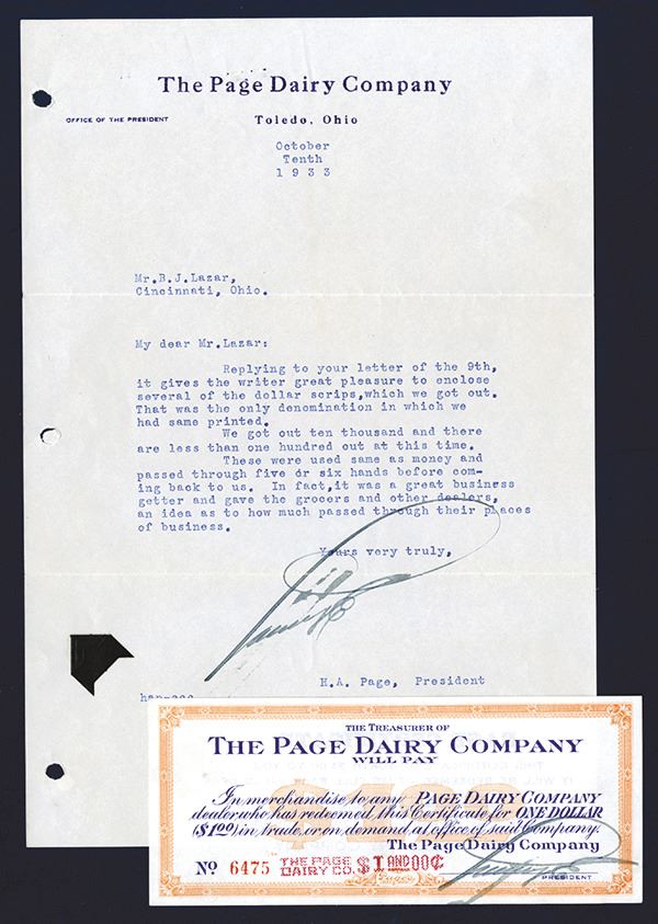 Ohio. 1 Dollar note and letter from the president of the company speaking about the success and use of the scrip notes.