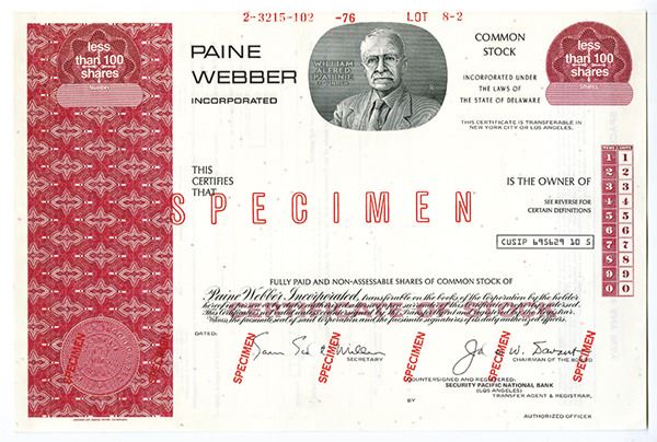 Delaware, 1976. <100 Shares Specimen Stock Certificate, Black text with pink border at left and underprint, William Alfred Paine portrait at top center. Red specimen overprints, POCs, VF condition. ABNC. Paine Webber Inc. was an American investment bank and stock brokerage firm.