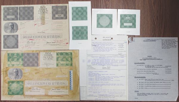 Lot includes 7 pieces, all related to the design and production of stock certificates for Paine Webber Jackson & Curtis Inc.; 100 Shares Proof Mock-Up on hard cardstock with design elements glued on, includes notes made in red ink; 100 Shares Proof Mock-Up heavily edited with many notes made in red ink throughout, on thin brown paper; Trio of intaglio printed proof design elements in green, includes company seal, >100 Shares piece, and left border in green, all on glossy white paper. Lot also includes Plant Order form from Security-Columbian Banknote Company and a thin paper copy of materials to be engraved. Unique lot of printing ephemera. 7 pieces.