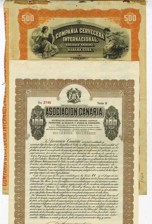 Cuba. 1) Compania Cerveceria Internecinal, $500 Issued 7% 1st Mortgage Gold Coupon Bond, Black print on orange border and under tint printed in Spanish and English, Allegorical figures at top flanking company title, Fine-VF condition. 2) Associacion Canaria, $100 Issued 6% Coupon Bond, Black print on brown border and under tint, Company title at top, VF-XF condition. 2 Pieces.
