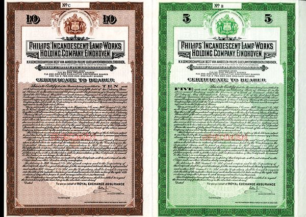 Pair of Philips' Incandescent Lamp Works Holding Company, Eindhoven, Specimens. 1930. Netherlands, 1930, 5 (green) and 10 (brown) Units, Royal Exchange arms, Bradbury Wilkinson, EF.