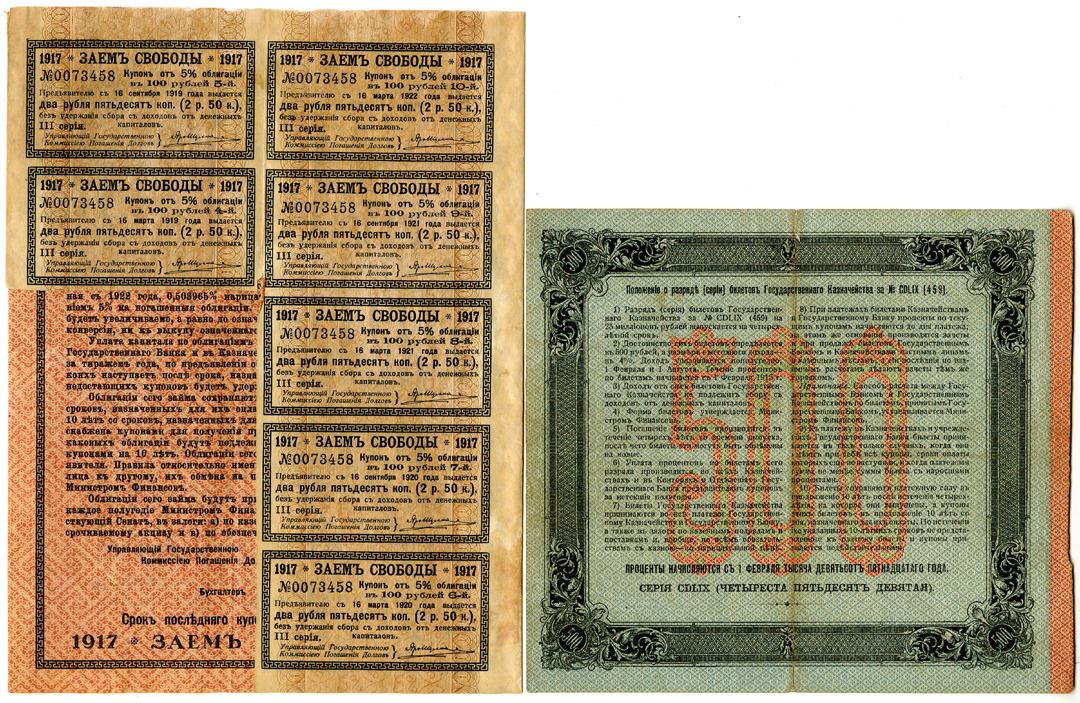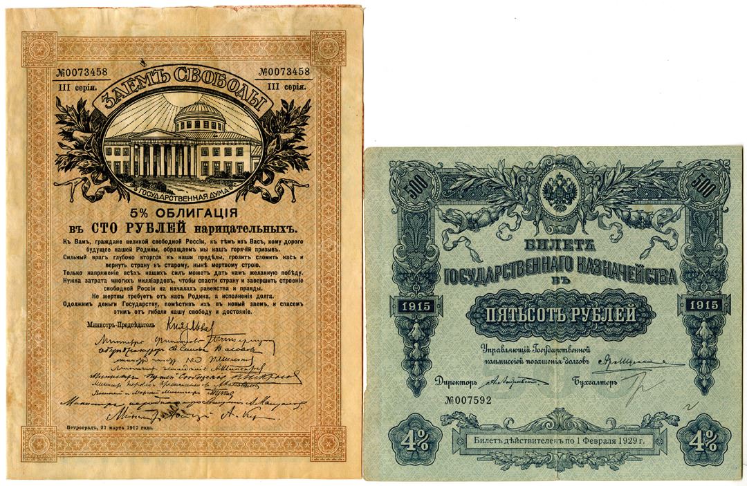 Russia. 2 Issued bonds, both in Russian: 1917, 100 Rubles Issued 5% Coupon Bond, P-37d, Black text with brown underprint, VF condition; and 1915 (1918), 500 Rubles Issued 4% Bond, P-59, Blue text on light blue underprint, VF condition.