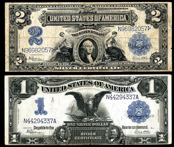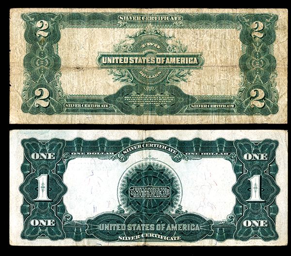 Pair of U.S. Large Size 1899 Silver Certificates/ 1) Fr#236, 1899 $1 Silver Certificate, VF-EF. 2) Fr#258, 1899, $2 Silver Certificate, Fine.