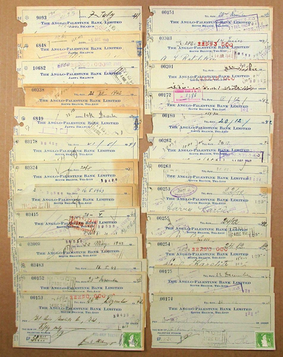 Tel-Aviv, Palestine, 1941-42. Lot of 10+ I/C Bank Checks with Revenue Stamps, Checks range from VF to XF condition with some not ripping cleanly along perforation. (15).