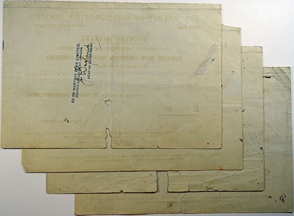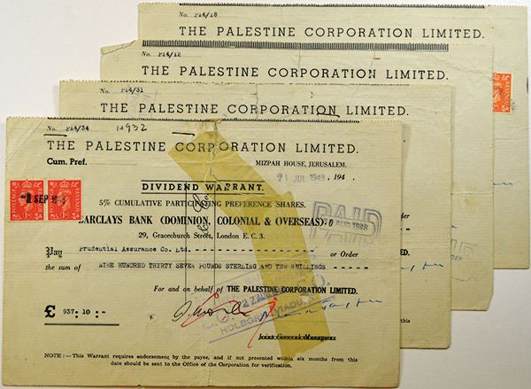 Israel. Group of 4 I/C Dividend Warrants for varying amounts, 5% Cumulative Participating Pregrence Shares Dividend Warrant Certificates, Fine-VF condition with repairs made. 4 Pieces.