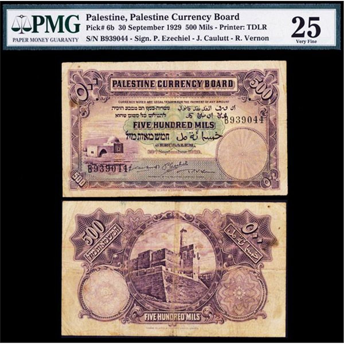 Palestine, 30th September, 1929, 500 Mils, P-6b, Issued, Purple on green underprint with Rachel's tomb on the left, back purple with Tower of David, Sign. P. Ezechiel - J. Caulutt - R. Vernon, S/N B939044, PMG graded Very Fine 25, Scarce in higher grade and attractive example of this scarce original note. TDLR.