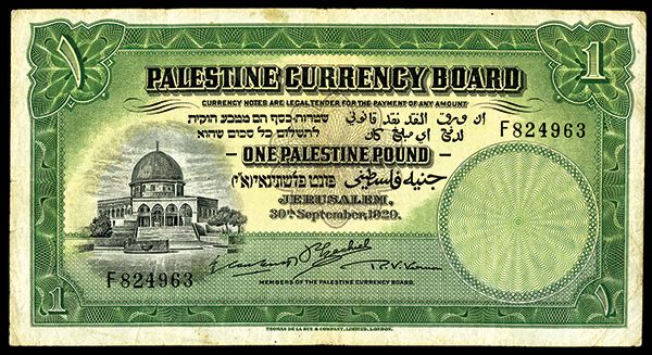 Palestine Currency Board, 1929 Issue Banknote. Palestine, 30th September, 1929, 1 Palestine Pound, P-7b, Issued, Black on green underprint with Dome of Rock on the left, back green with Tower of David, S/N F824963, PMG graded Very Fine 25, NET, with note of foreign substance and light stains, attractive example of this scarce original note. TDLR.