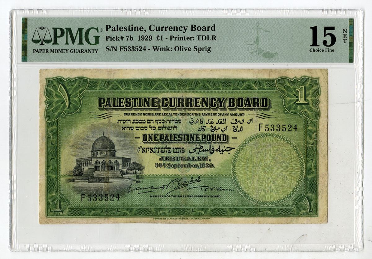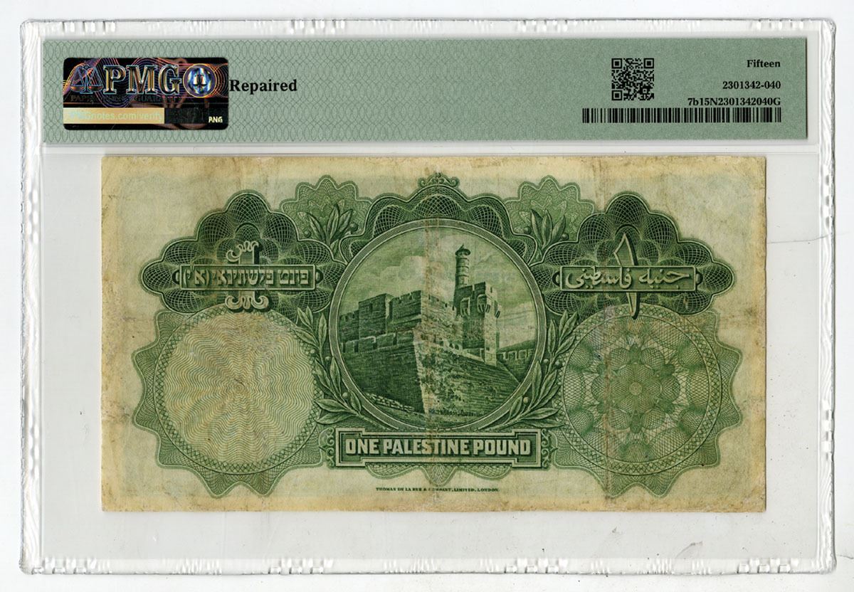 Palestine, 1929. 1 Pound, P-7b, Issued Banknote, Green on m/c underprint with Dome of the Rock at center, Back is green with Tower of David at center, S/N F533524, PMG graded Choice Fine 15 NET with comment "Repaired," TDLR.