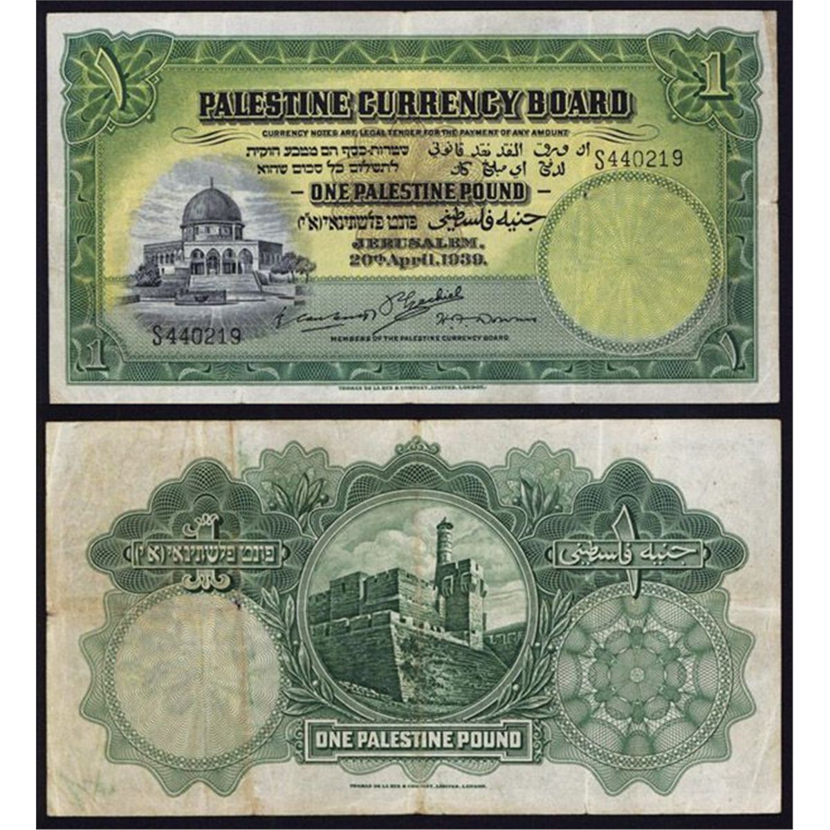Palestine, 20th April, 1939, 1 Palestine Pound, P-7c, Issued, Black on green underprint with Dome of Rock on the left, back green with Tower of David, Sign. Sir P. Ezechiel - Sir J. Caulutt - H. Downie, S/N S440219, VF to Choice VF condition with large even margins, bright colors, firm paper and sharp corners, a premium example for the grade, attractive example of this scarce original note. TDLR.