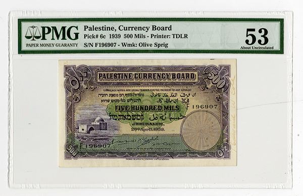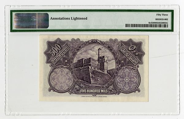 Palestine. Issued 500 Mils, 1939, P-6c, S/N F196907, PMG About Unc 53 with "Annotations Lightened", TDLR.
