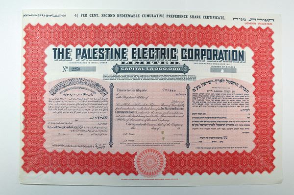 Israel. 4-1/2 Shares Certificate. BW&Co. English, Arabic and Hebrew. Faux date of 1954 inked in. Large format specimen.