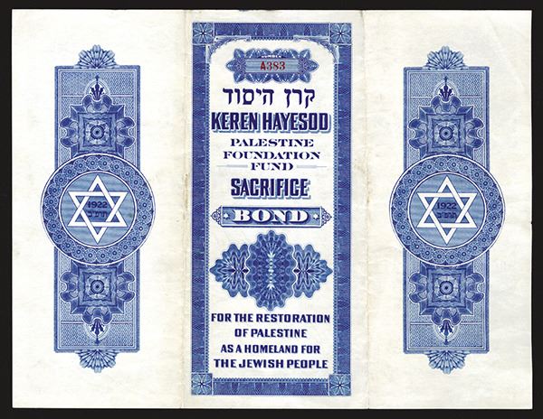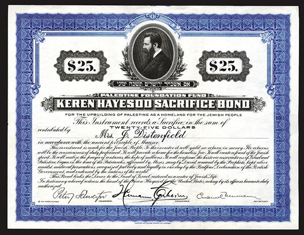 Palestine, 1922, $25, I/U Bond, "For the Up building of Palestine as a Homeland for the Jewish People". Rare Specimen Donation Bond. Blue border. Portrait of Theodore Herzl. VF condition. Extremely rare and important Palestine related bond.