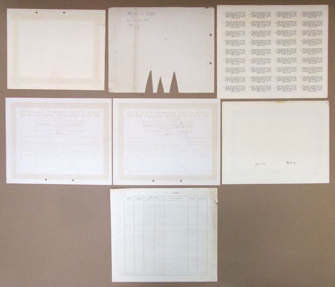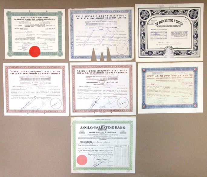 Israel, 1921-63. Lot of 7 I/C Certificates, Includes: Kupat Ashrei Eretz Israel Credit Bank Ltd.; 1921, Anglo-Palestine Co. Ltd.; A.P.B. Investment Co. Ltd.; and more. Certificates range from VF to XF condition. (7). Sold "AS IS" no returns accepted.
