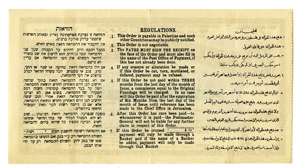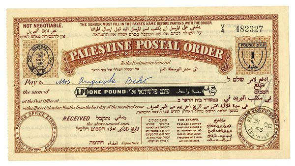 Tel-Aviv, Palestine - Israel, 1 Pound, Issued Brown with black text in middle, In English, Hebrew and Arabic, XF with one light vertical fold in middle keeping the note from Uncirculated.