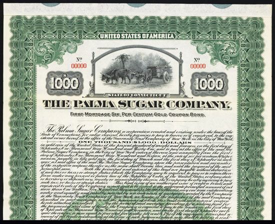 Cuba, 1916, $1000, 1st Mortgage 6% Gold Coupon Specimen Bond, Black on green border and underprint, Vignette top center of wagon drawn by four oxen, VF-XF condition, FLBNC.