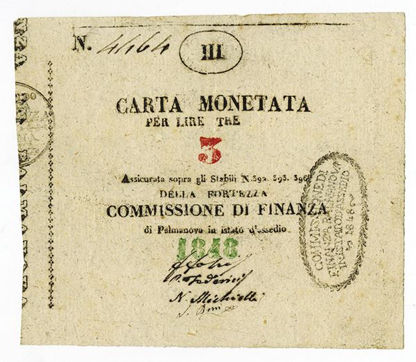 Italy, 3 Lire, P-S248, Issued banknote, Black on red "3" and green date, oval seal at left, XF-AU. Rare note in any condition and first time this variety has been offered by us.