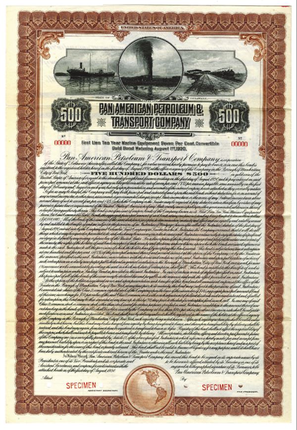 Delaware. $500 Specimen 7% 1st Lien Marine Equipment Convertible Gold Coupon Bond, Black print on brown border and under tint, Images of railroad tracks, ships, and an oil geyser at top, Specimen overprints and POC's, Fine-VF condition, ABNC.