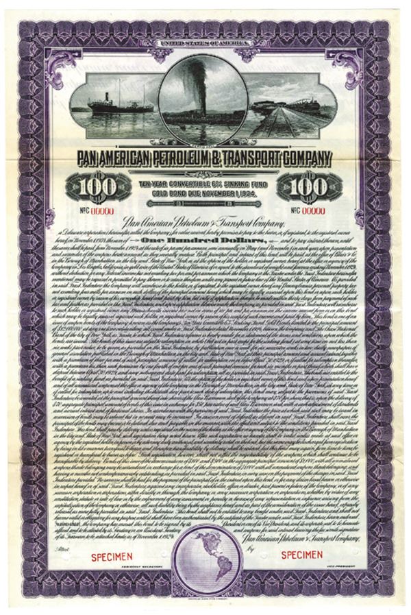 Delaware. $100 Specimen 6% Convertible Sinking Fund Gold Coupon Bond, Black print on purple border and under tint, Large ship at left, oil geyser in middle, and train tracks at top right, Specimen overprints and POC's, VF-XF condition.