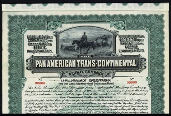 Uruguay, 1910, $1,000. 5% 50-year gold debenture bond. Green border w/ men herding cattle vignette, ABNCo. Specimen w/ coupons, XF, Rare Uruguay railroad bond.